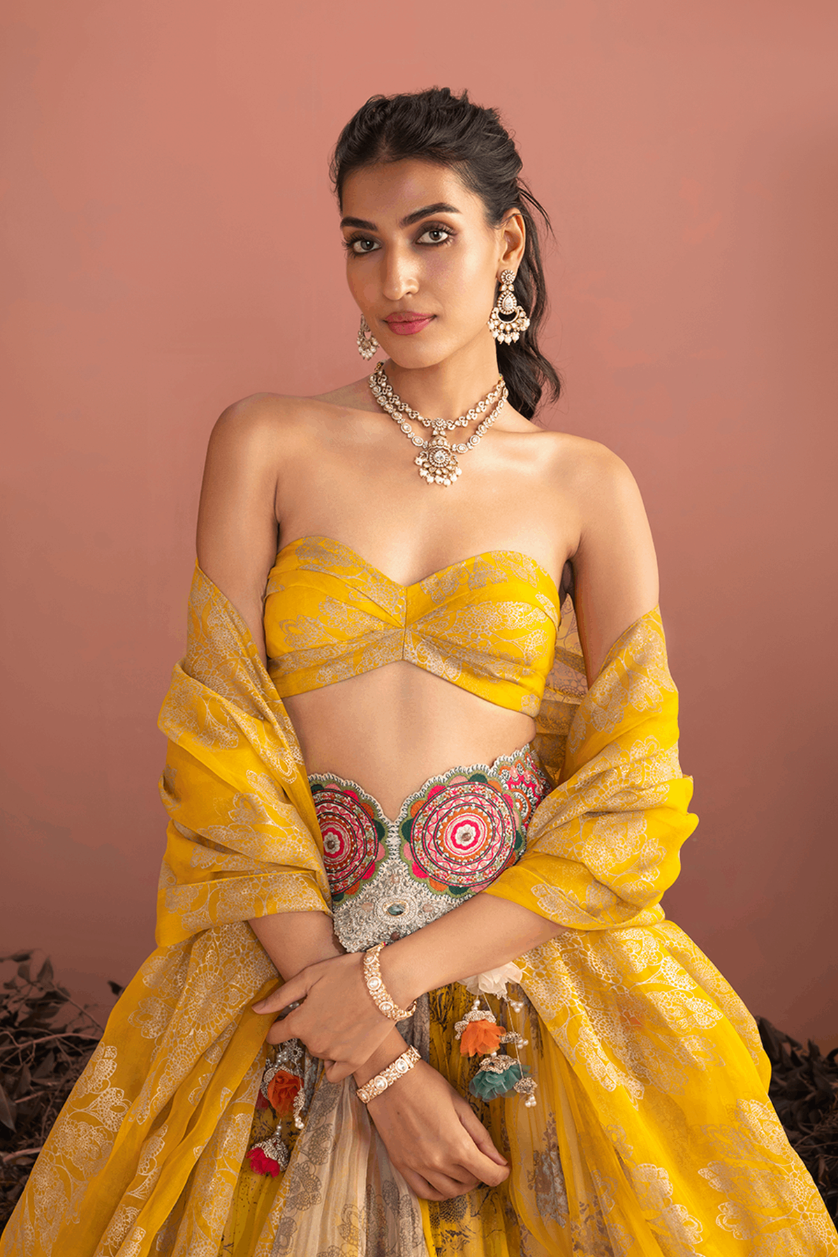 Mustard multihues embroidered waist skirt with tara bustier.