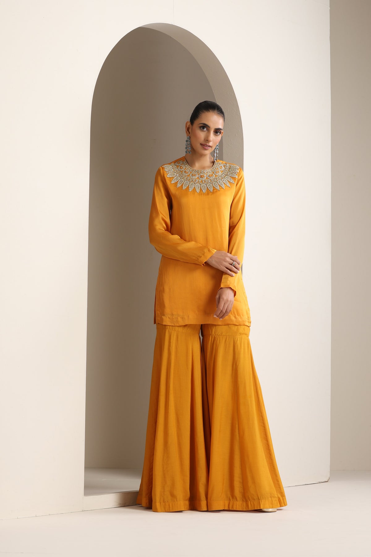 Featuring mustard short kurta with sharara paired with and matching printed dupatta.