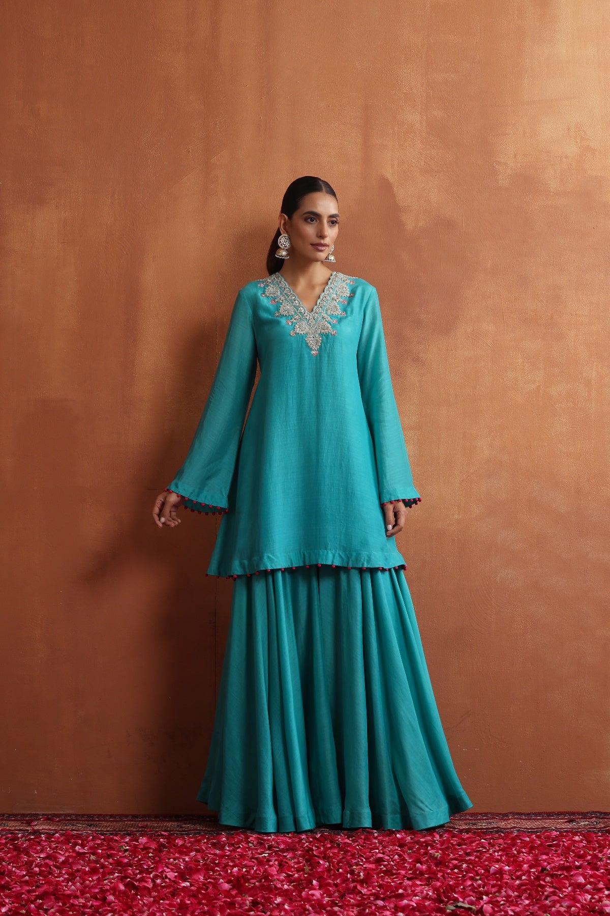 Featuring Aqua blue V neck embroidered kurta paired with matching Sharara