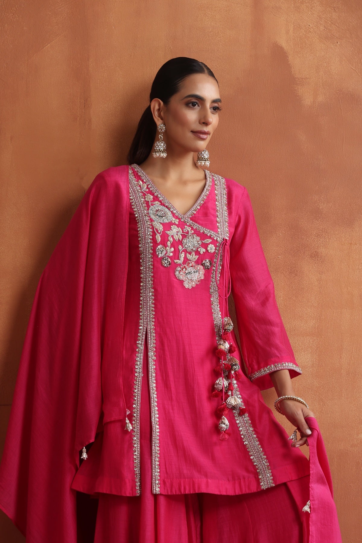Featuring fuchsia embroidered kurta with tassel detailing in front paired with matching sharara and dupatta
