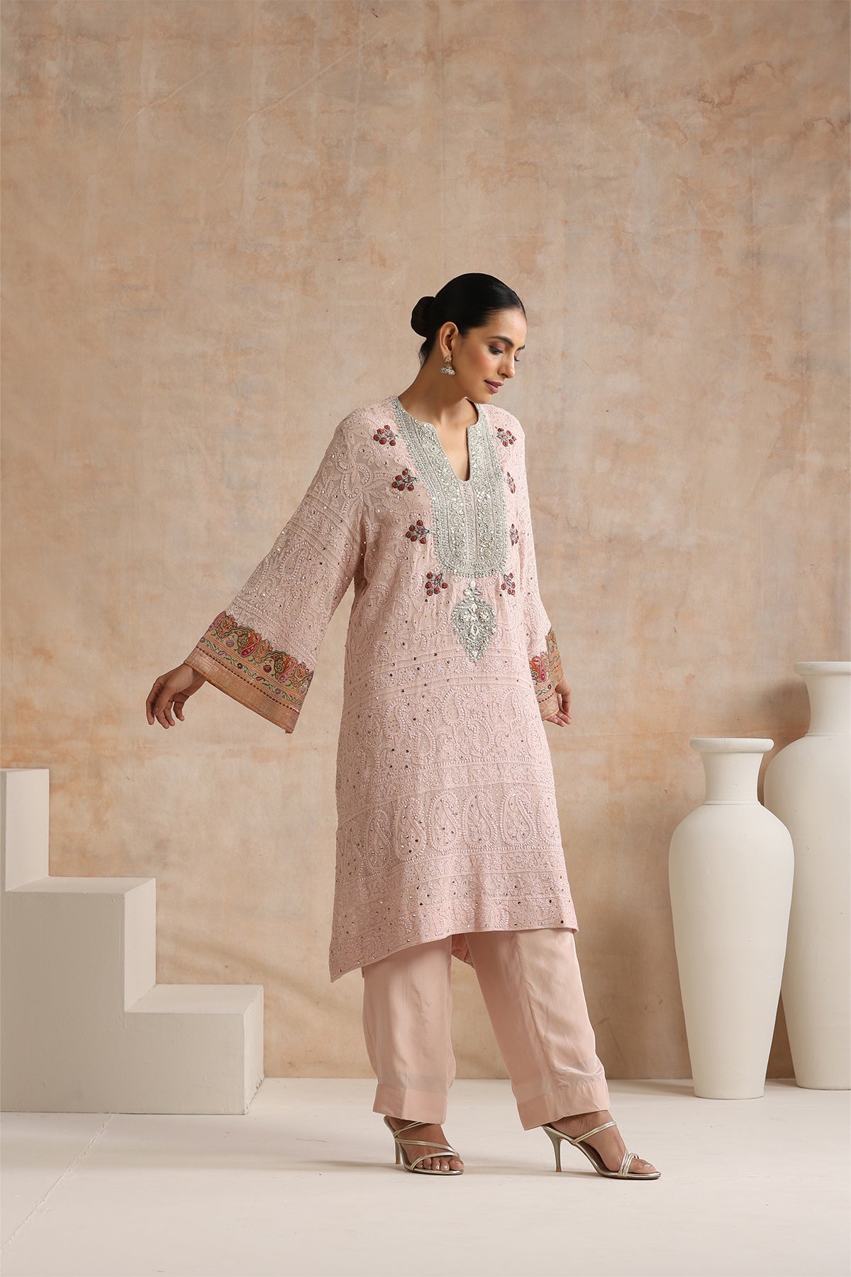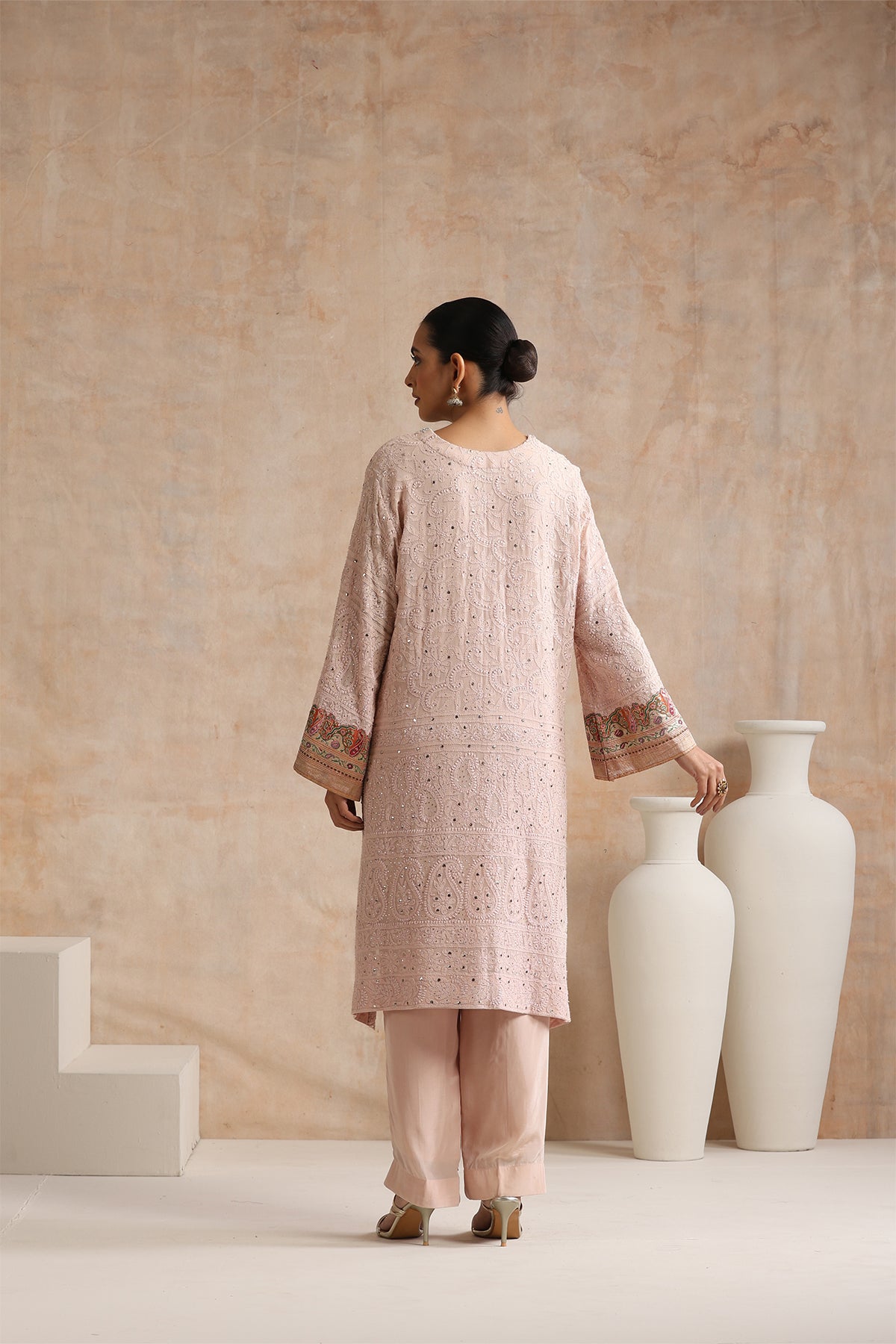 Featuring blush pink chikankari embroidered kurta with banarsi border on sleeves paired with matching pants set.