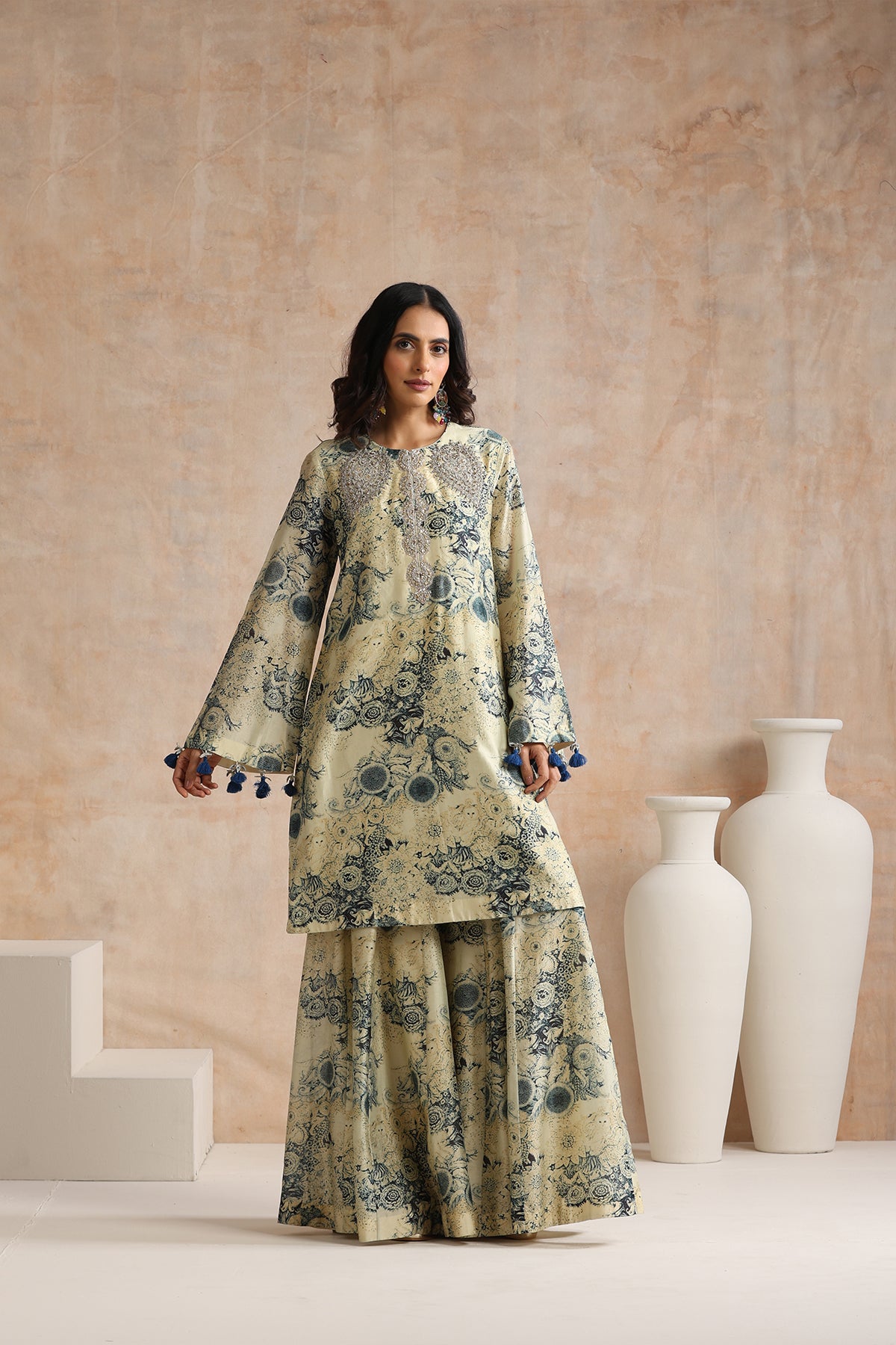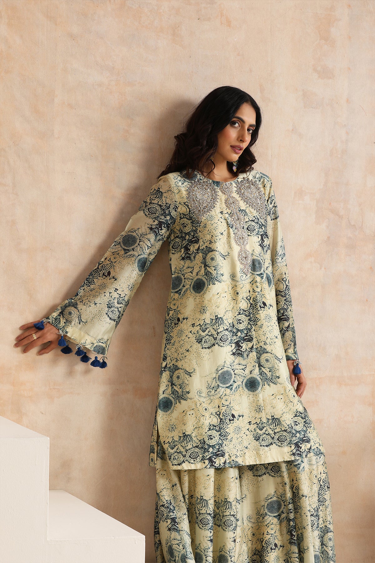 Featuring mint &blue embriodered kurta paired with matching sharara.