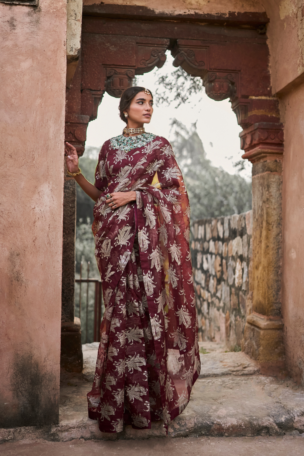 Burgundy rosette belted saree set