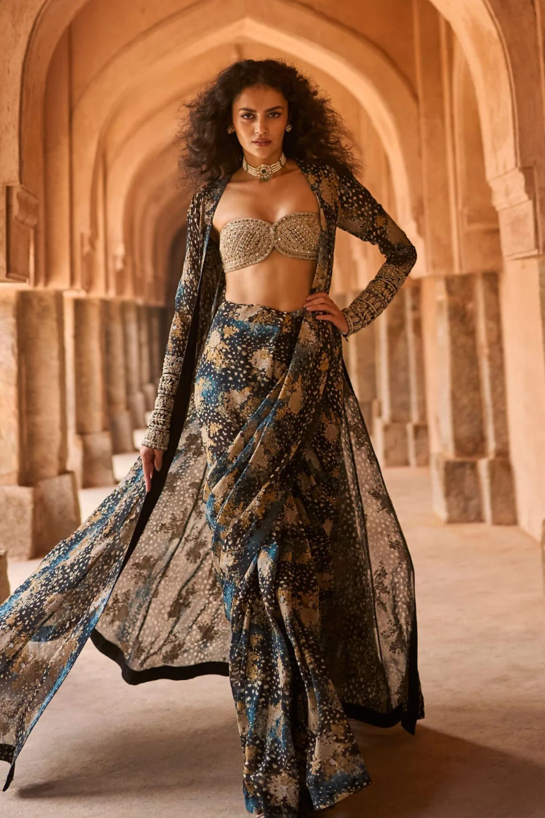 Champagne & blue cape set with blossom saree