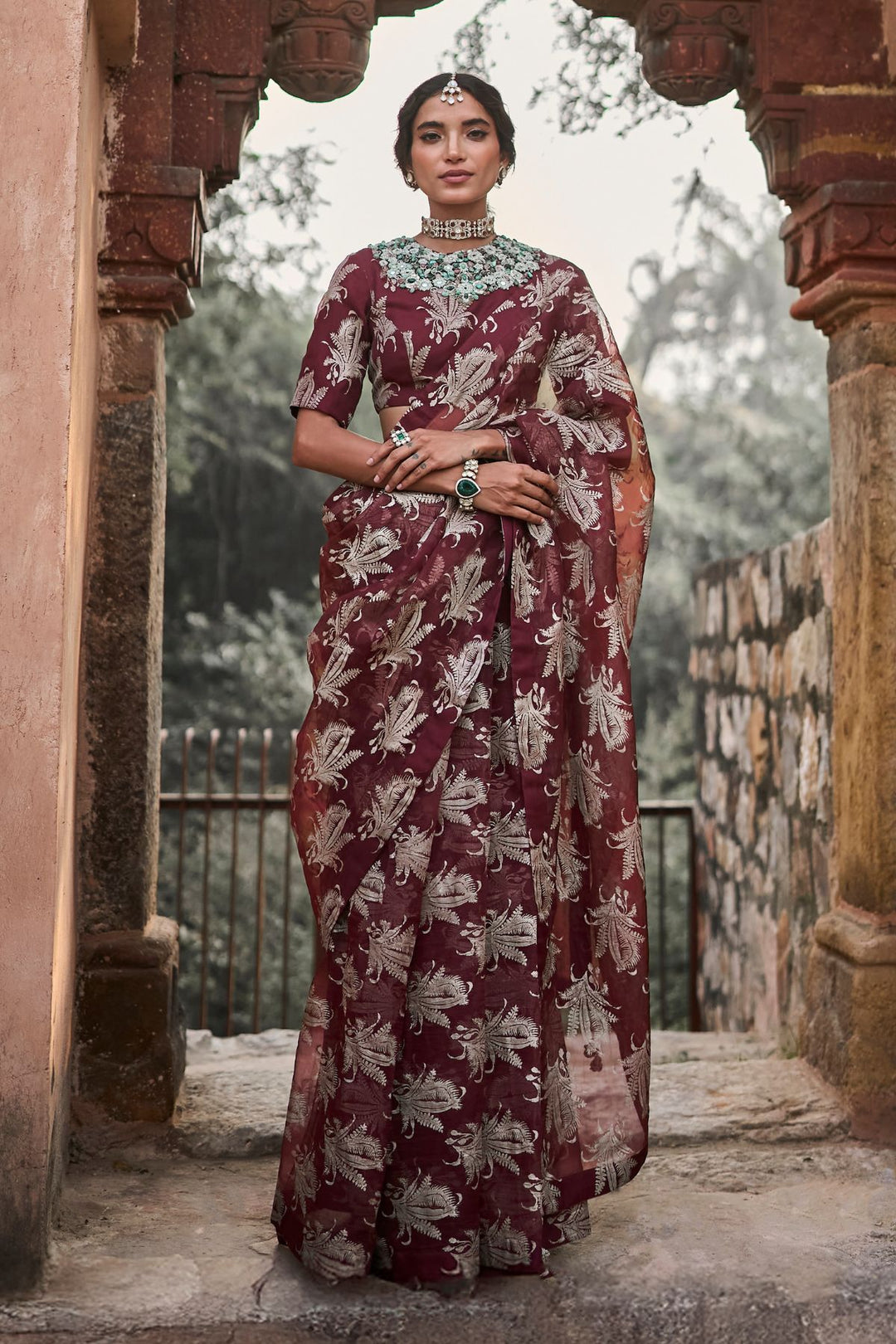 Red saree with embroidered blouse