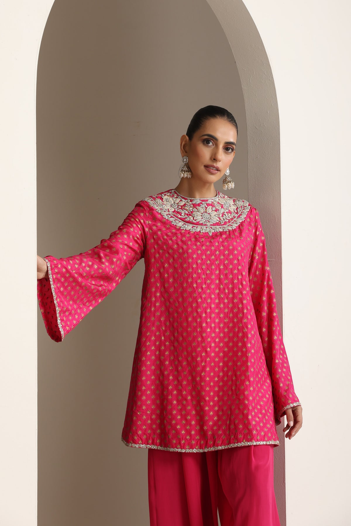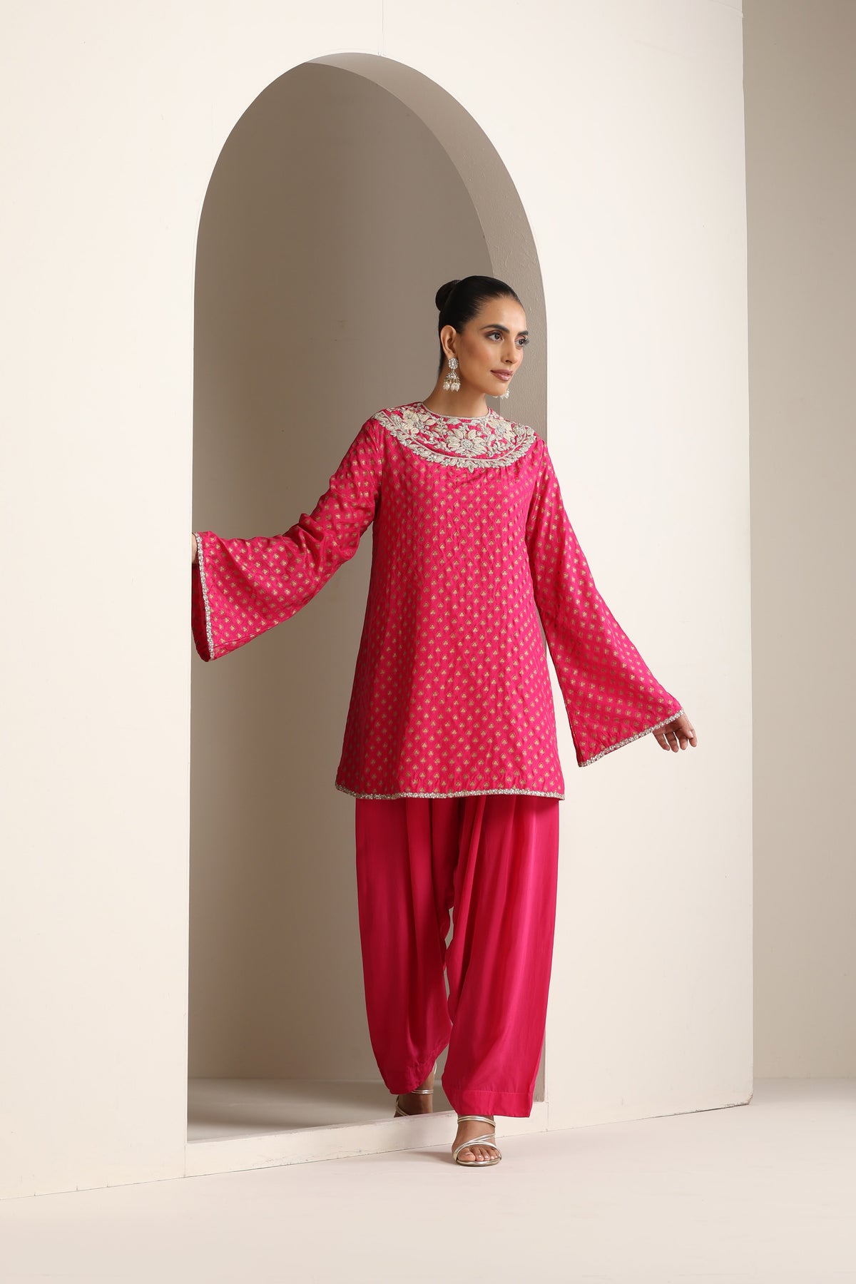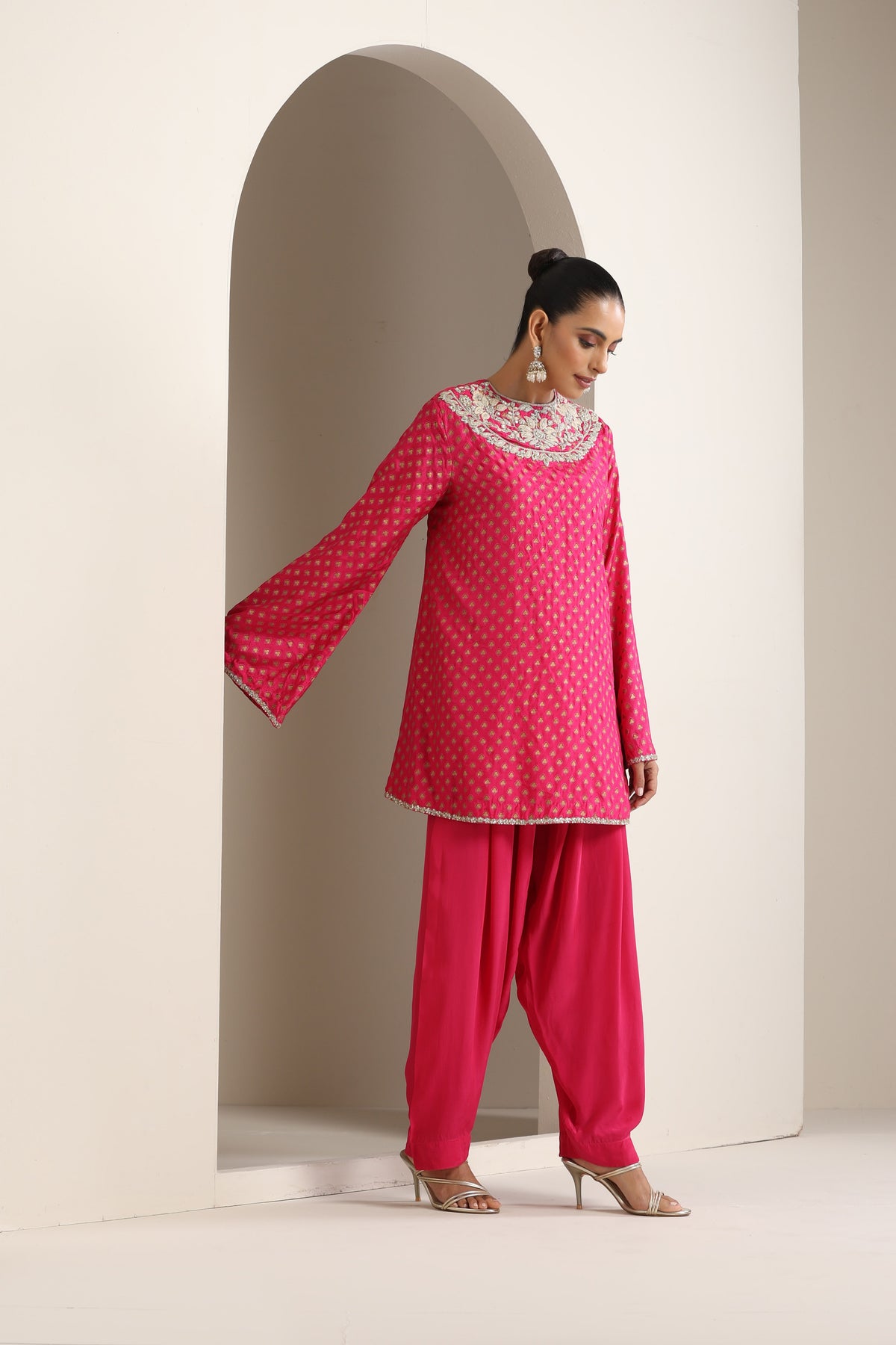 Featuring fuchsia printed embroidered short kurta paired with solid salwar.