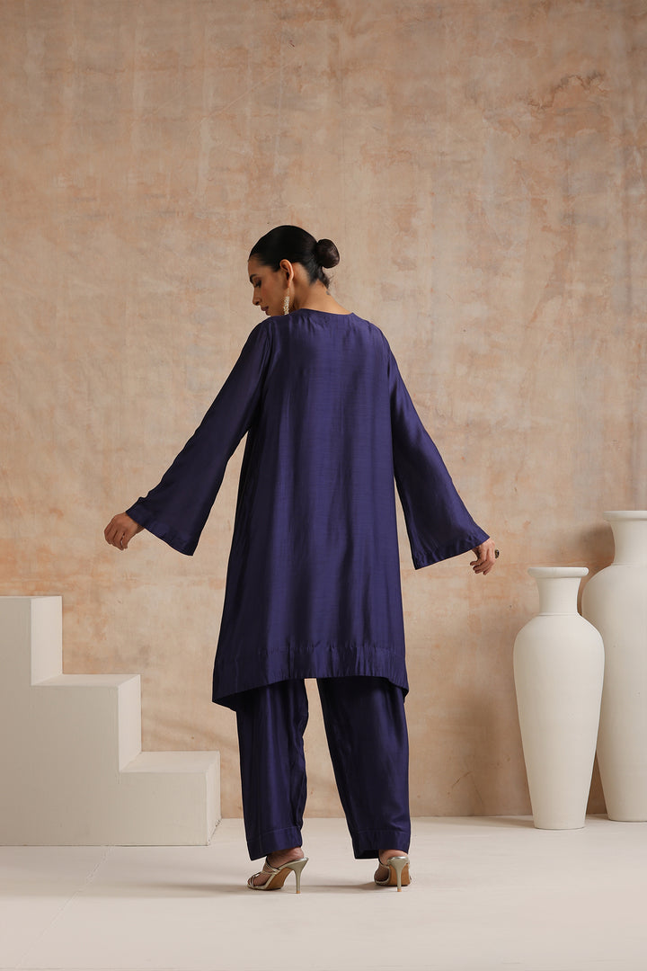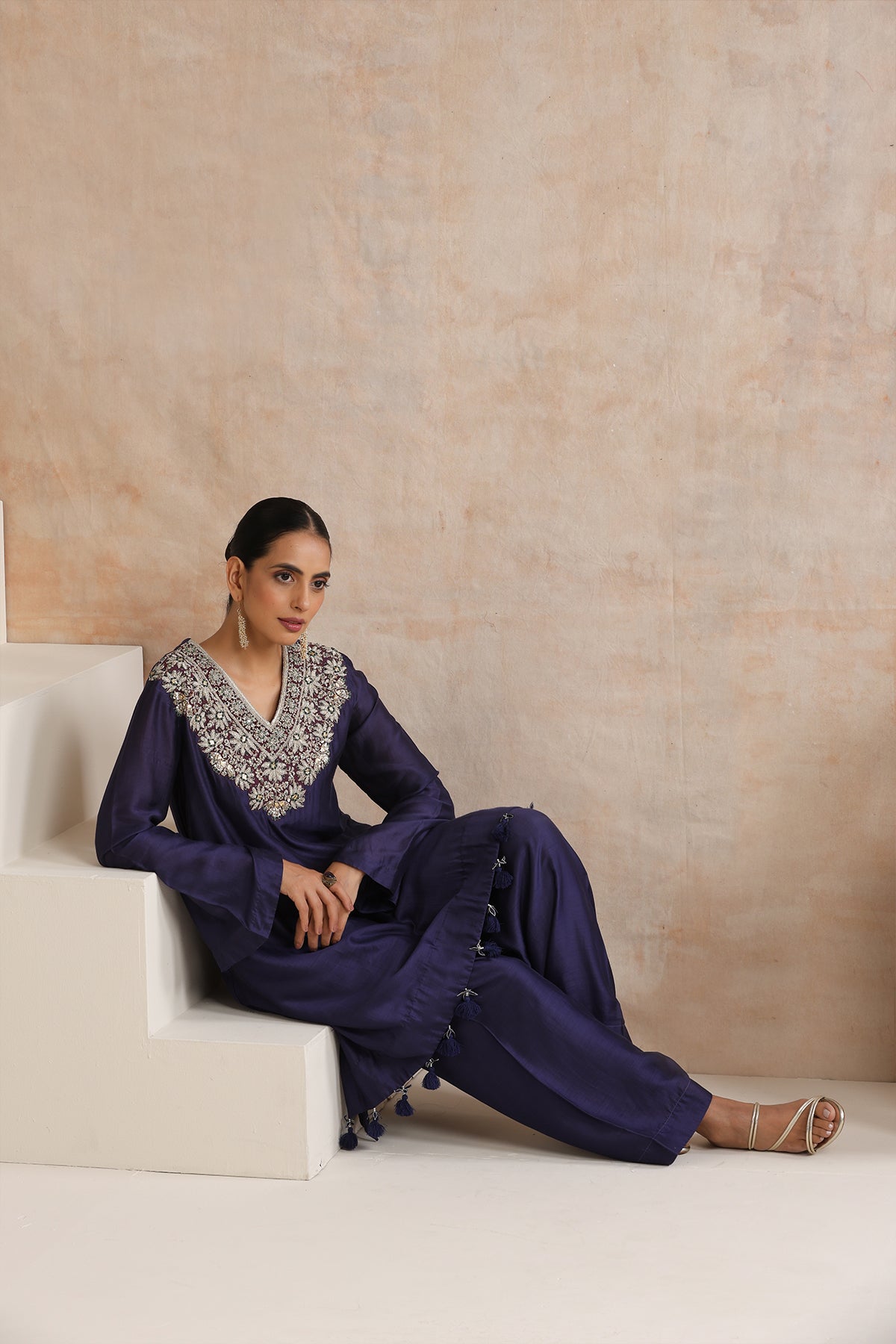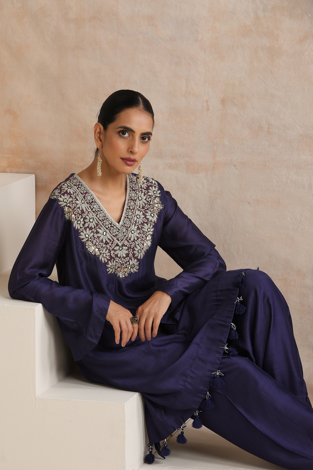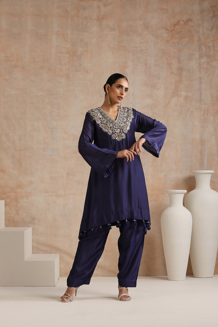 Featuring navy blue emboridered kurta with tassel detailing on hem and its paired with matching salwar.