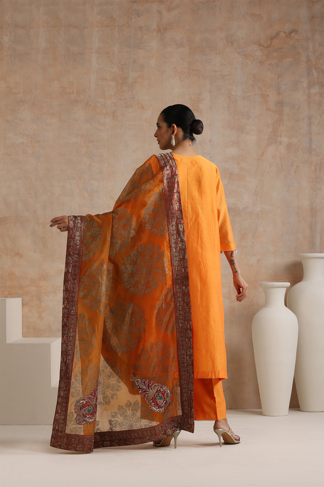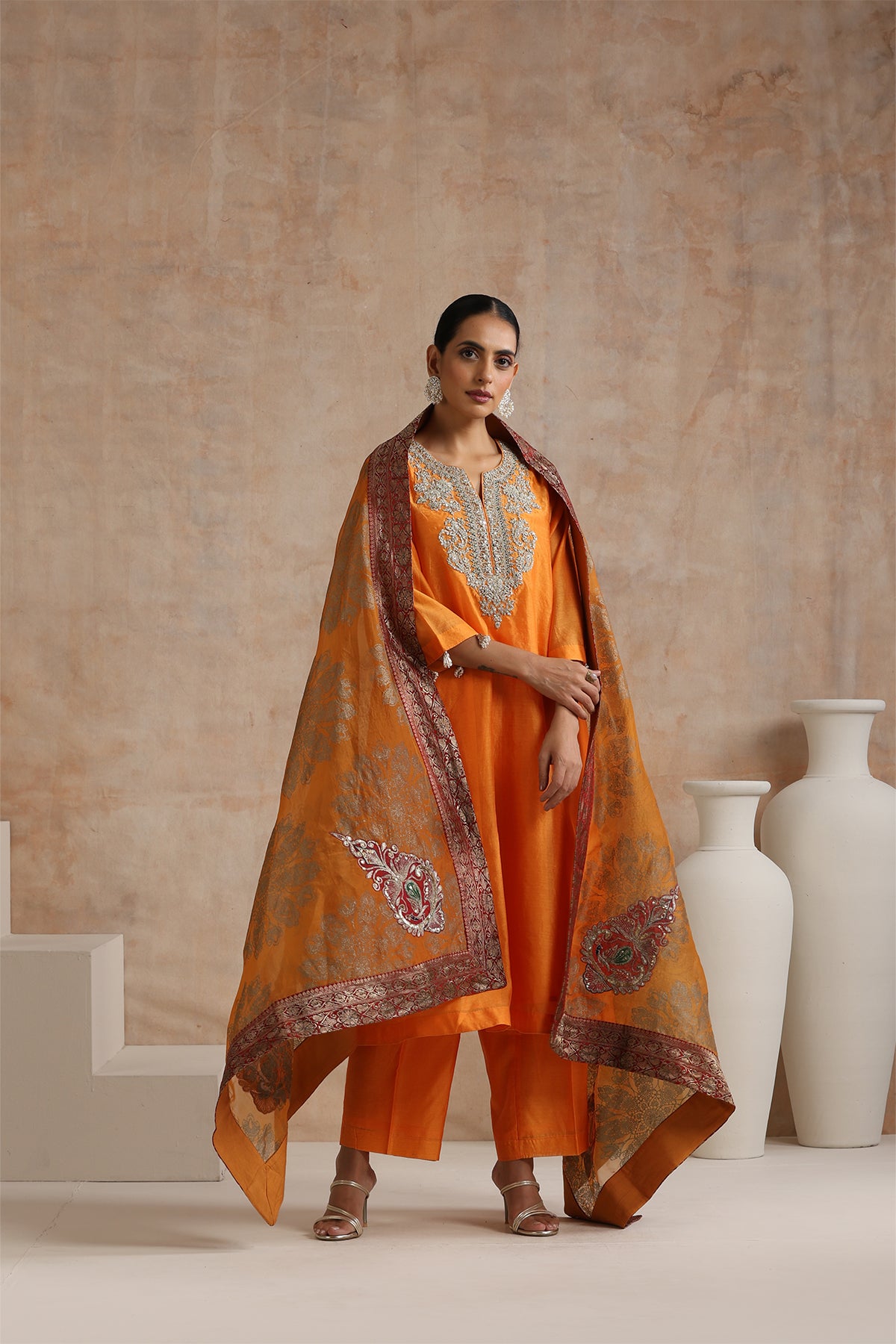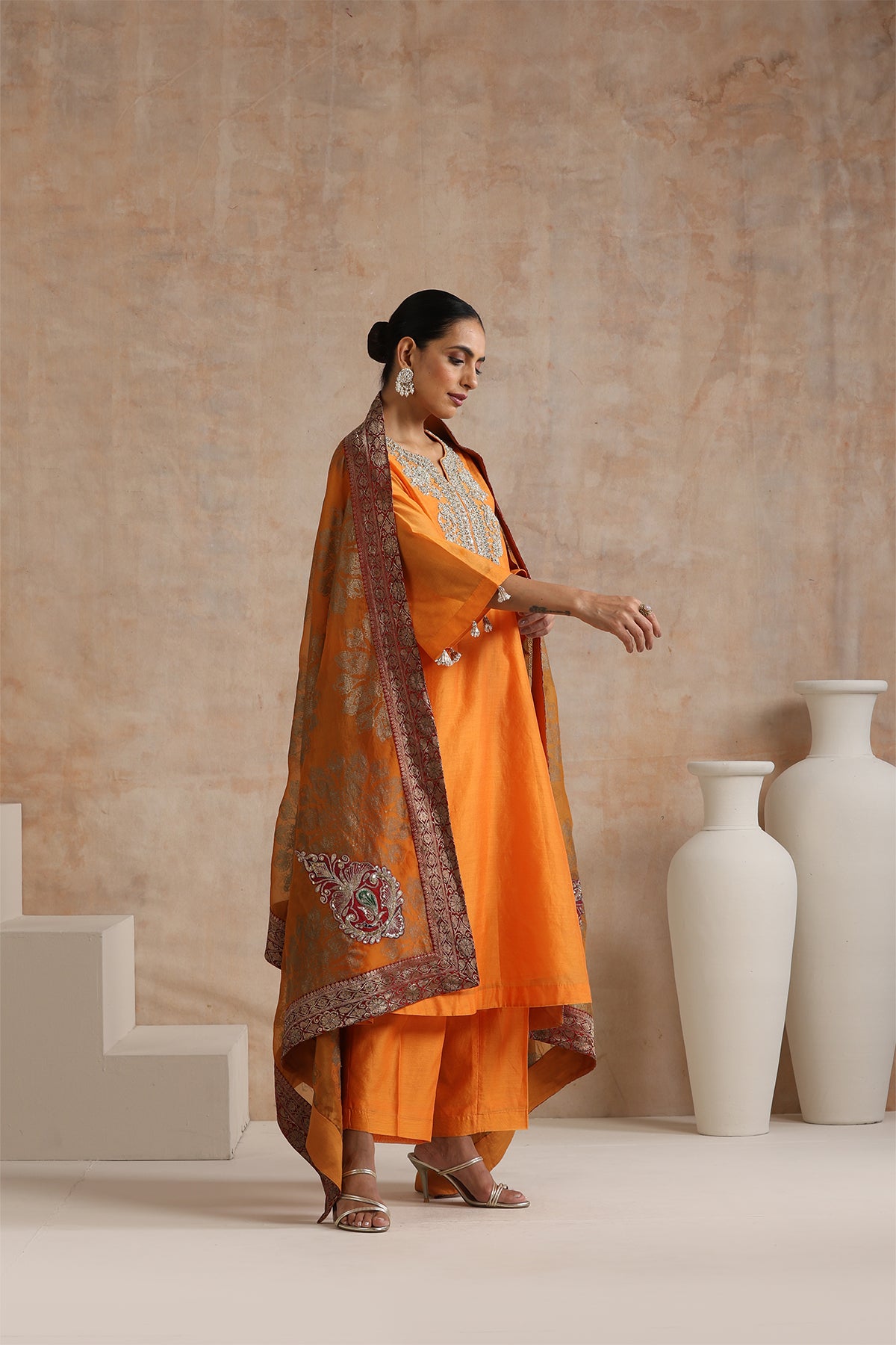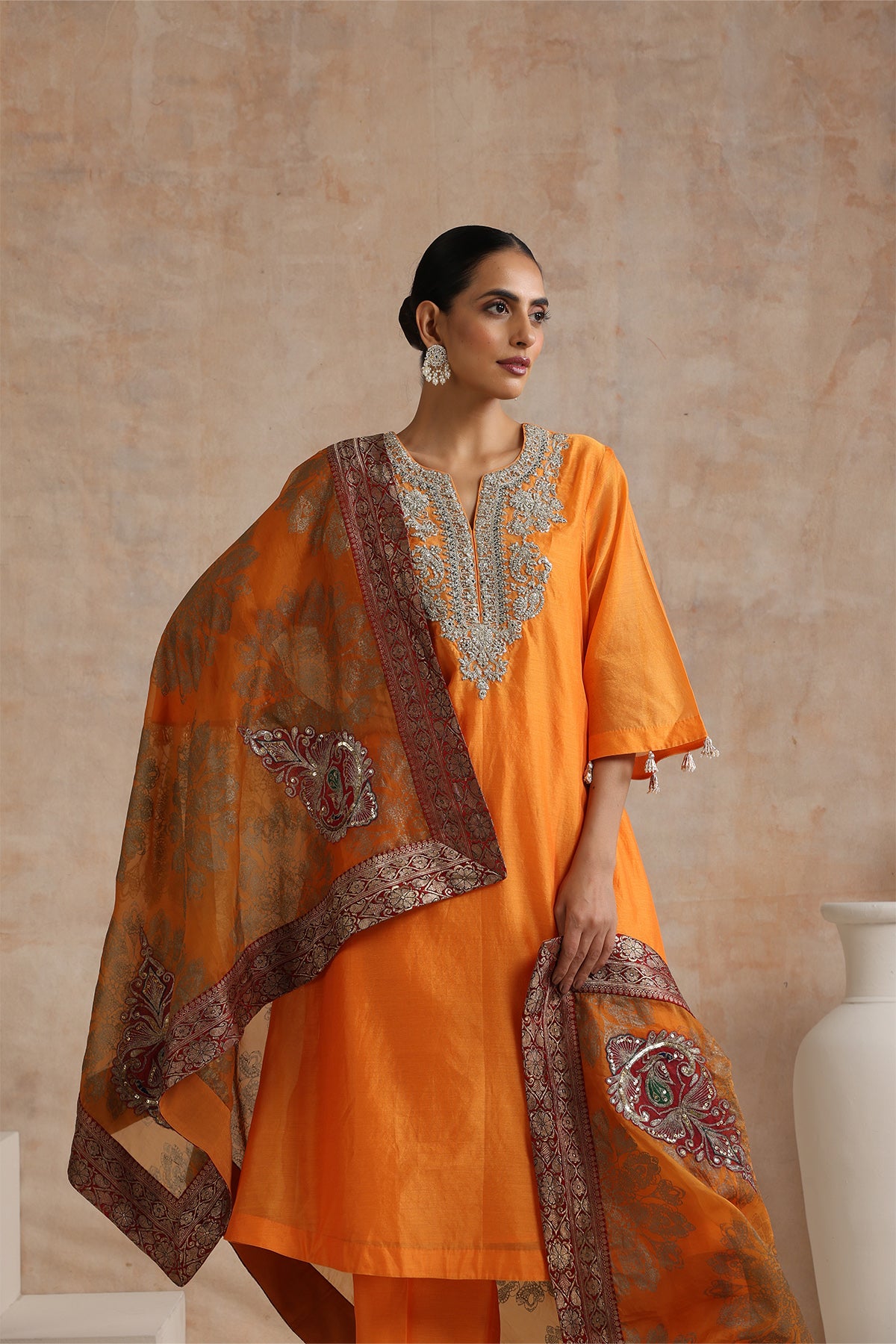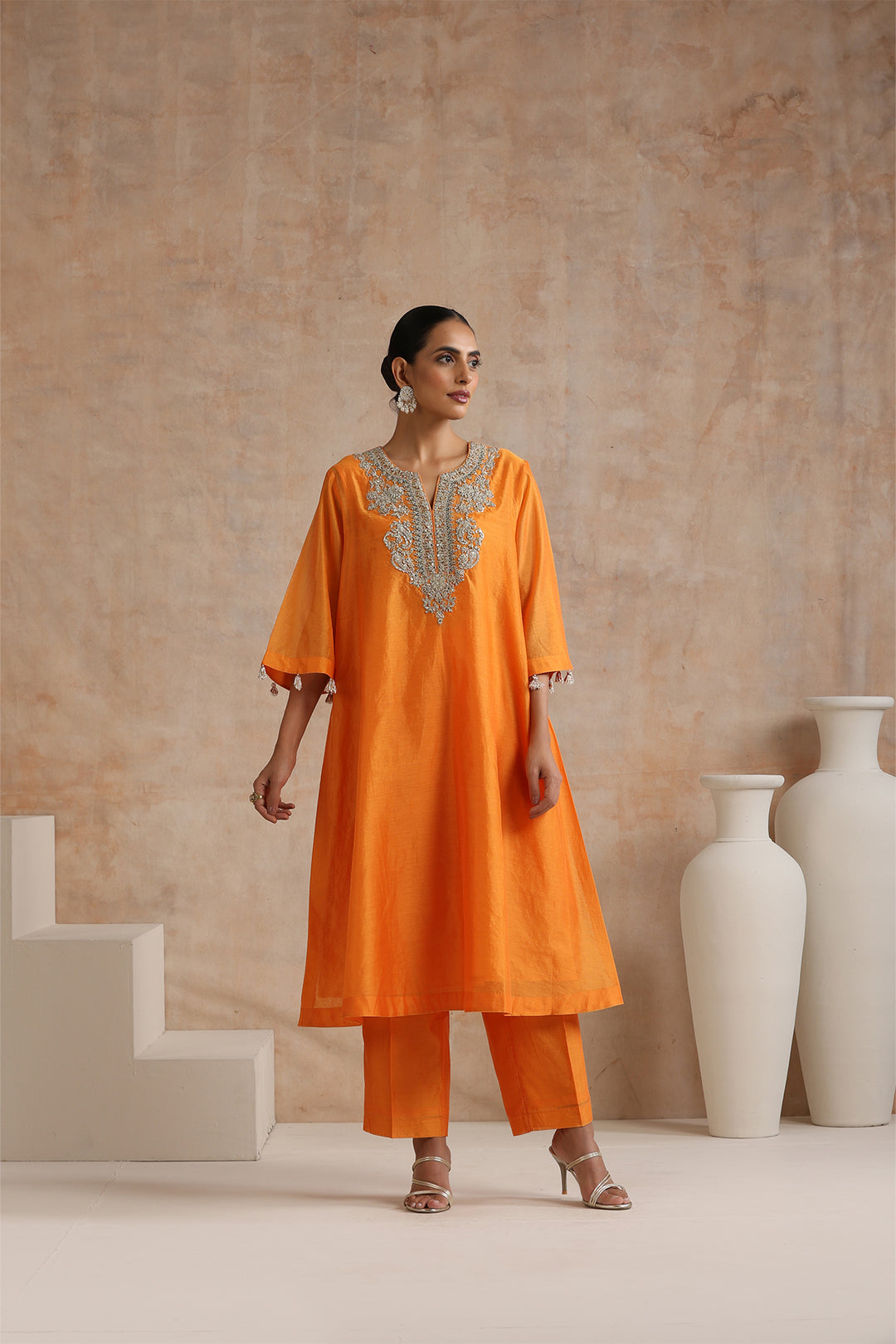 Featuring orange embroidered kurta with tassel detailing on sleeves paired with matching pants.