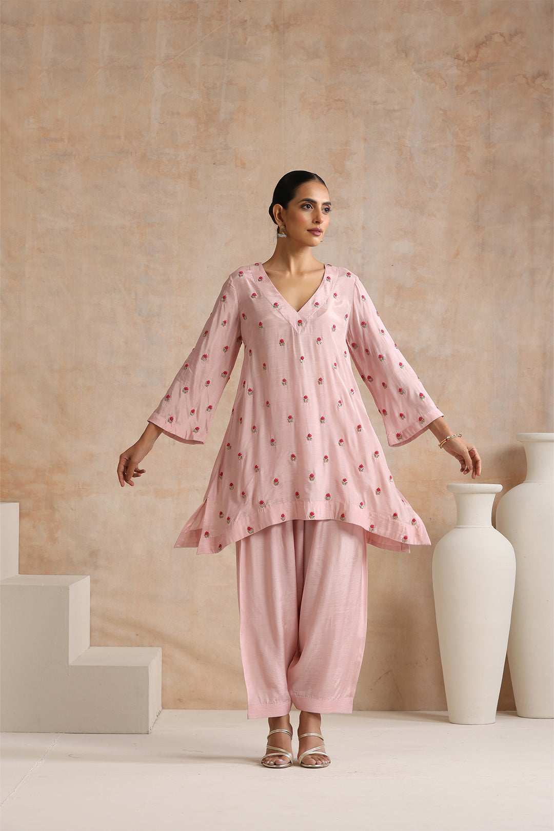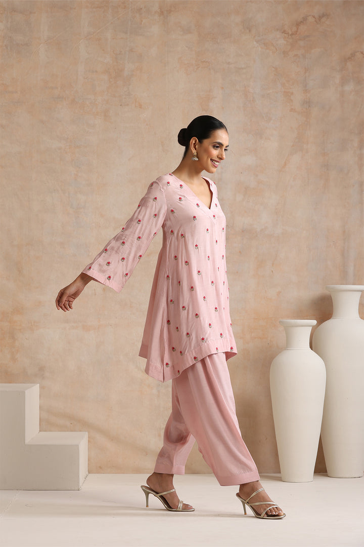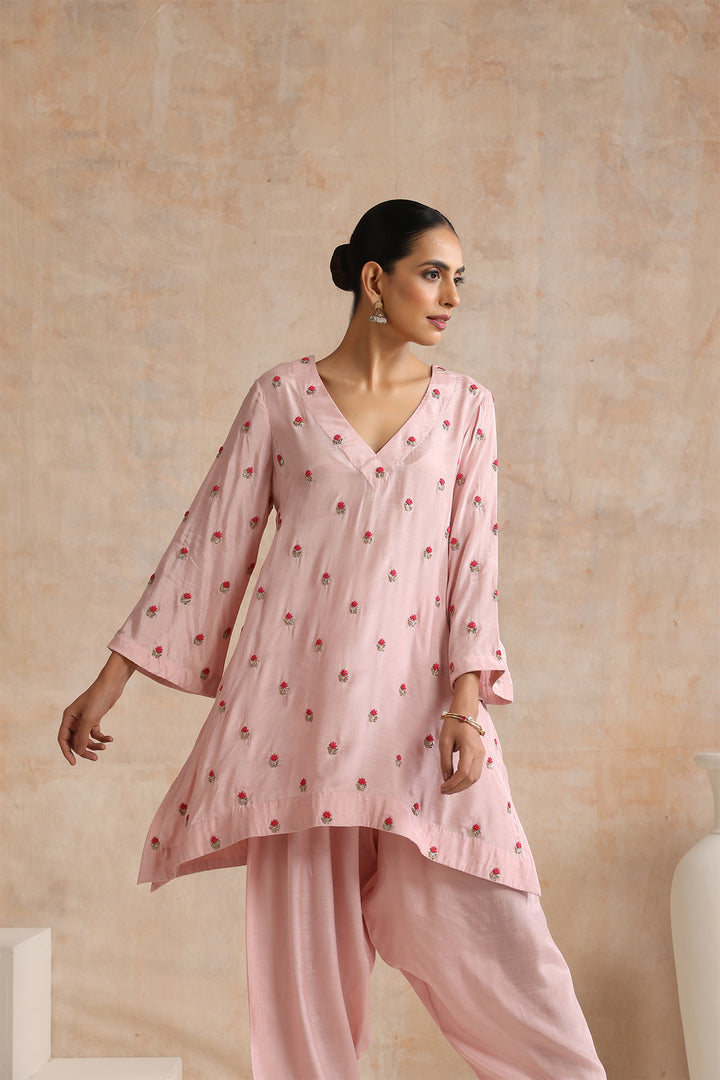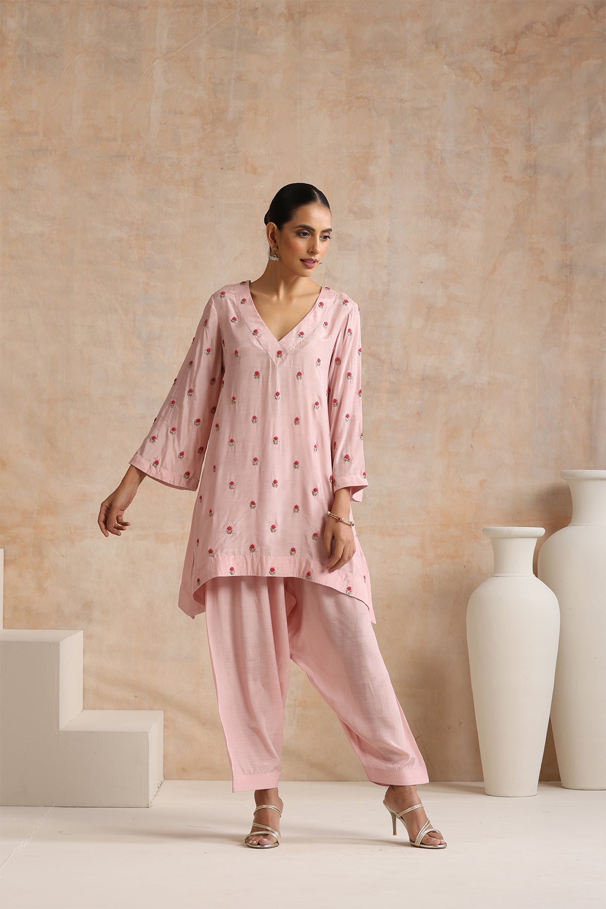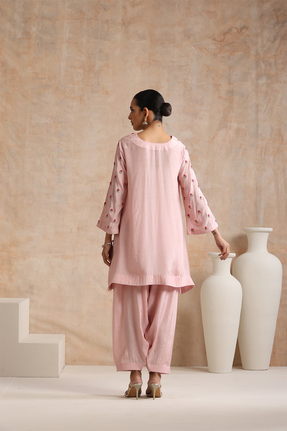 Featuring blush pink with red pearls work on kurta paired with matching salwar.