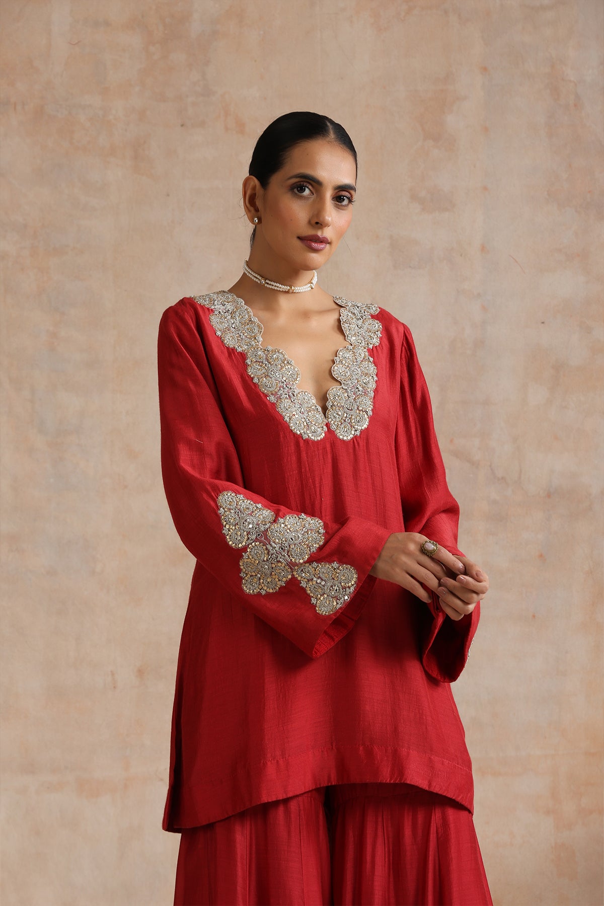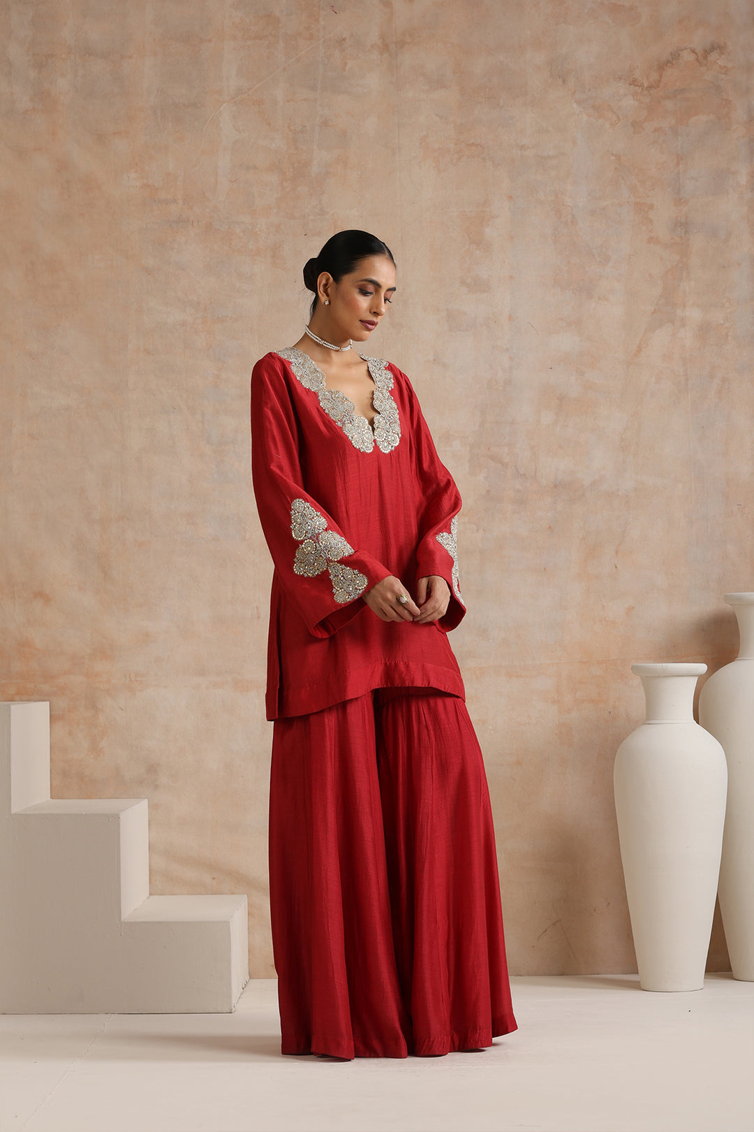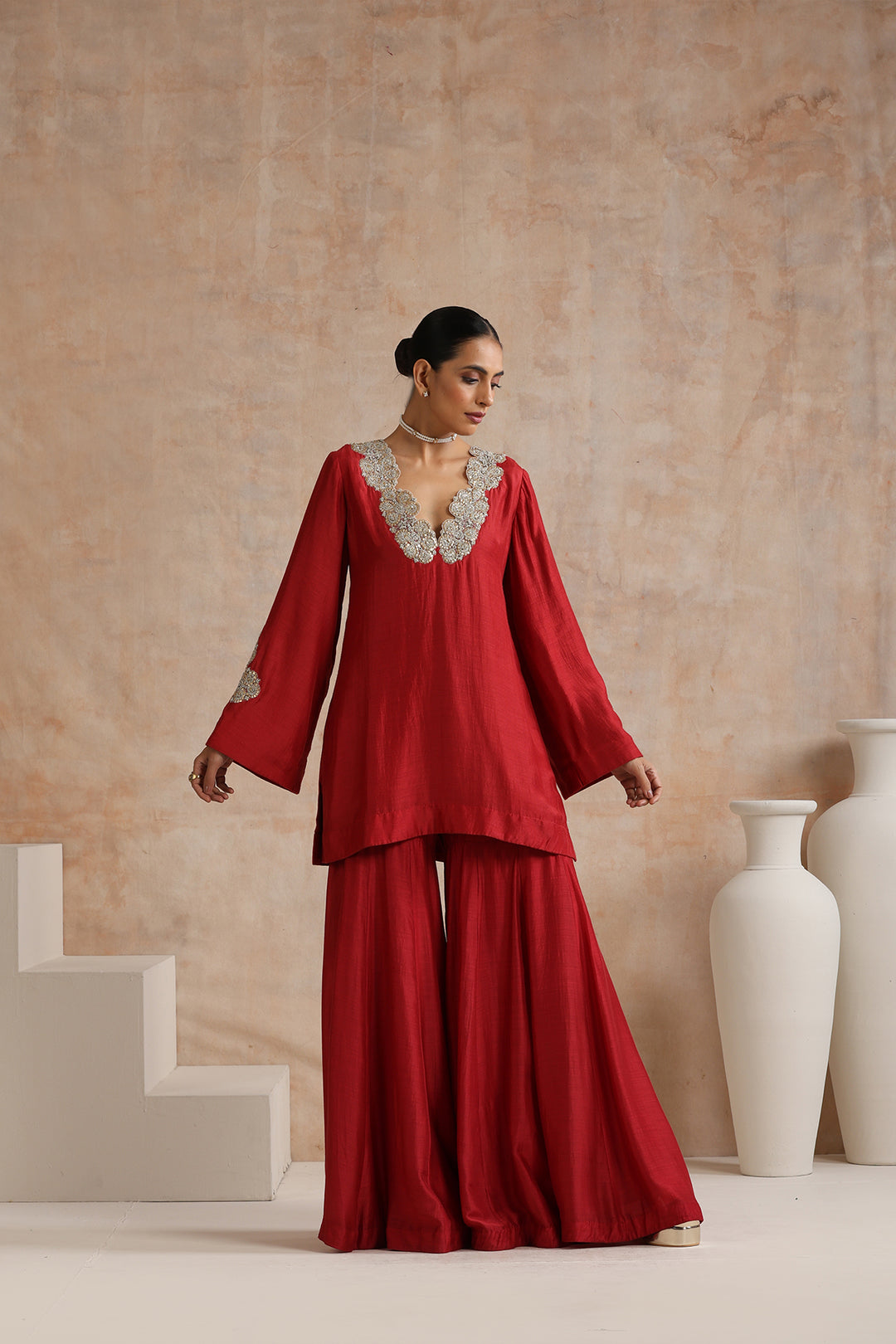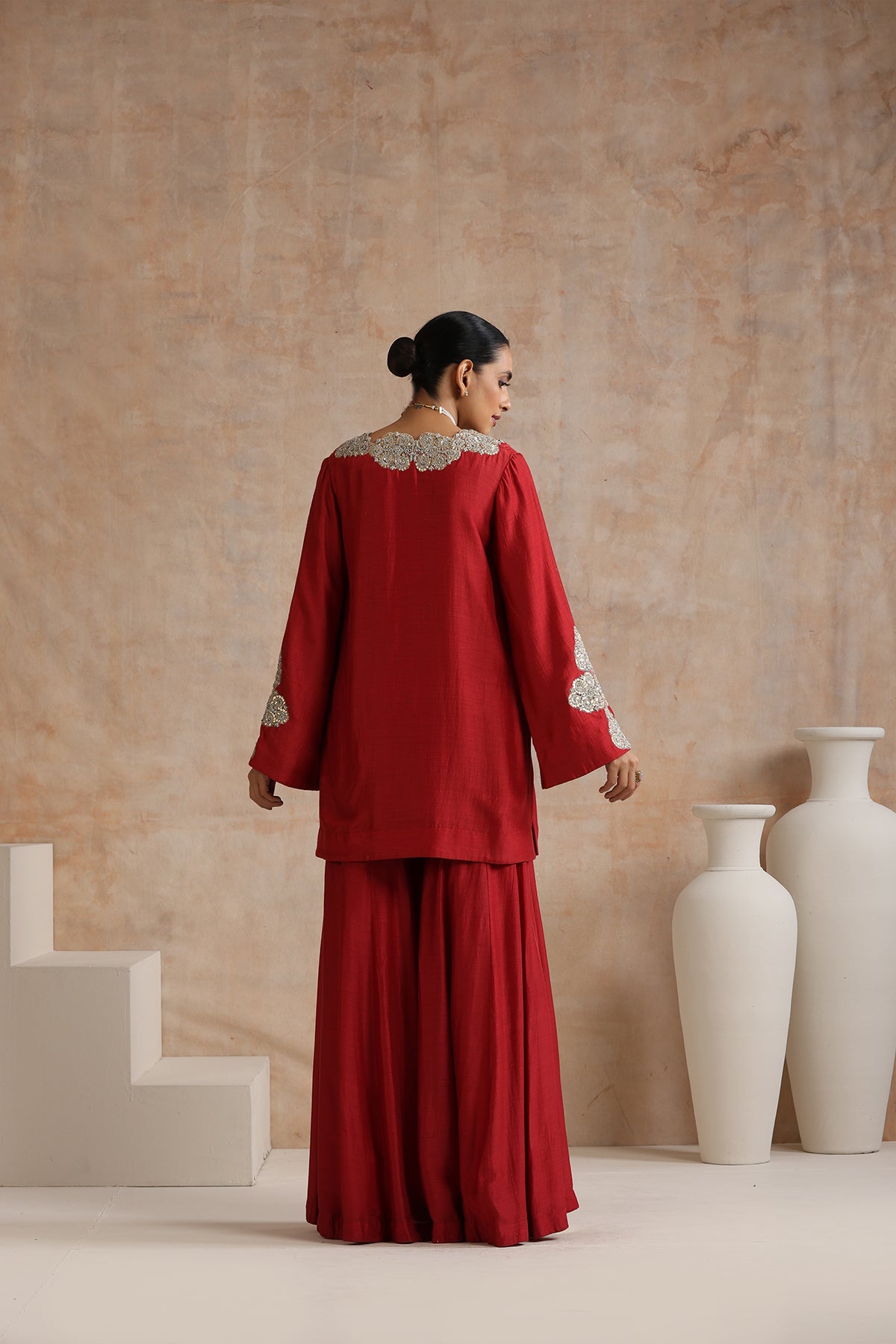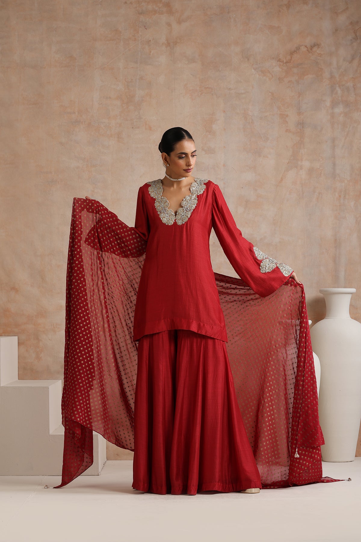 Featuring Deep red embroidered kurta paired with matching sharara set.